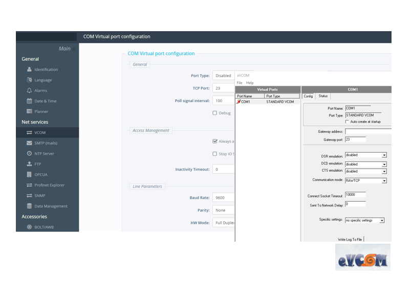 eVCOM di HMS Networks è un potente componente che consente di creare porte seriali virtuali e controllarle sotto ogni aspetto. In pratica le porte virtuali così create non si distinguono dalle porte seriali fisiche utilizzate per le applicazioni di comunicazione Utilizzando un router industriale Ewon e il software eVCOM, è possibile stabilire l’accesso remoto a qualsiasi dispositivo o PLC in cui si impieghi un protocollo seriale proprietario.