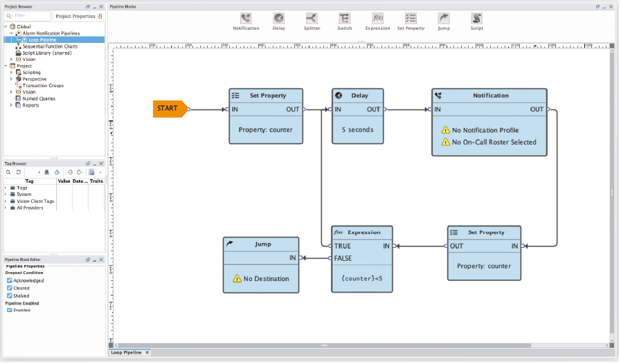 - Editor grafico per la definizione delle logiche (pipeline) di notifica e di escalation (notifica multipla, ritardata, etc)