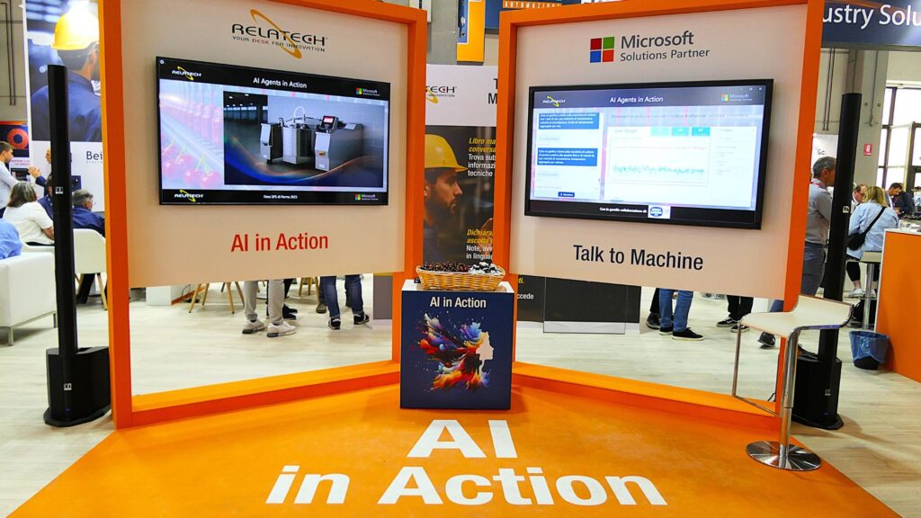 Tra le principali novità presentate allo stand G005 – Padiglione 5, ha suscitato  grande interesse la demo “AI in Action”, una simulazione immersiva che ha mostrato come l’Intelligenza Artificiale generativa possa trasformare l’interazione tra operatore e macchina attraverso il linguaggio naturale: interrogazione e consultazione dei manuali tecnici, accesso e visualizzazione dei dati macchina in tempo reale, e gestione delle dichiarazioni di produzione. Un esempio concreto di Human Collaborative Interface (HCI), dove l’AI non si limita a rispondere a un comando vocale, ma collabora attivamente con l’operatore.