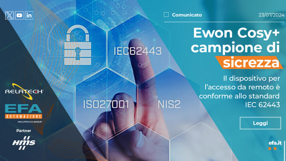 Ewon Cosy+ di HMS Networks è conforme allo standard IEC 62443  Per HMS Networks, partner storico di EFA Automazione – azienda parte del gruppo Relatech – la sicurezza è una pietra miliare: l’azienda da sempre investe per soddisfare i più […]